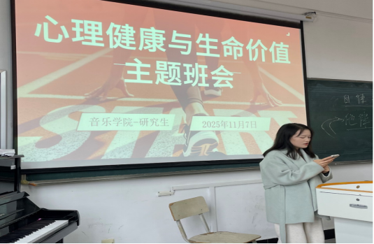 为深入落实“时代新人铸魂工程”要求,帮助研究生树立正确生命观、价值观,11月7日中午13时,永利集团304am登录学科教学(音乐)专业在艺术楼B206教室举办“以乐悟生,向阳而行”生命价值教育主题班会,全体研究生齐聚一堂,在音乐浸润与思想碰撞中探寻生命真谛。