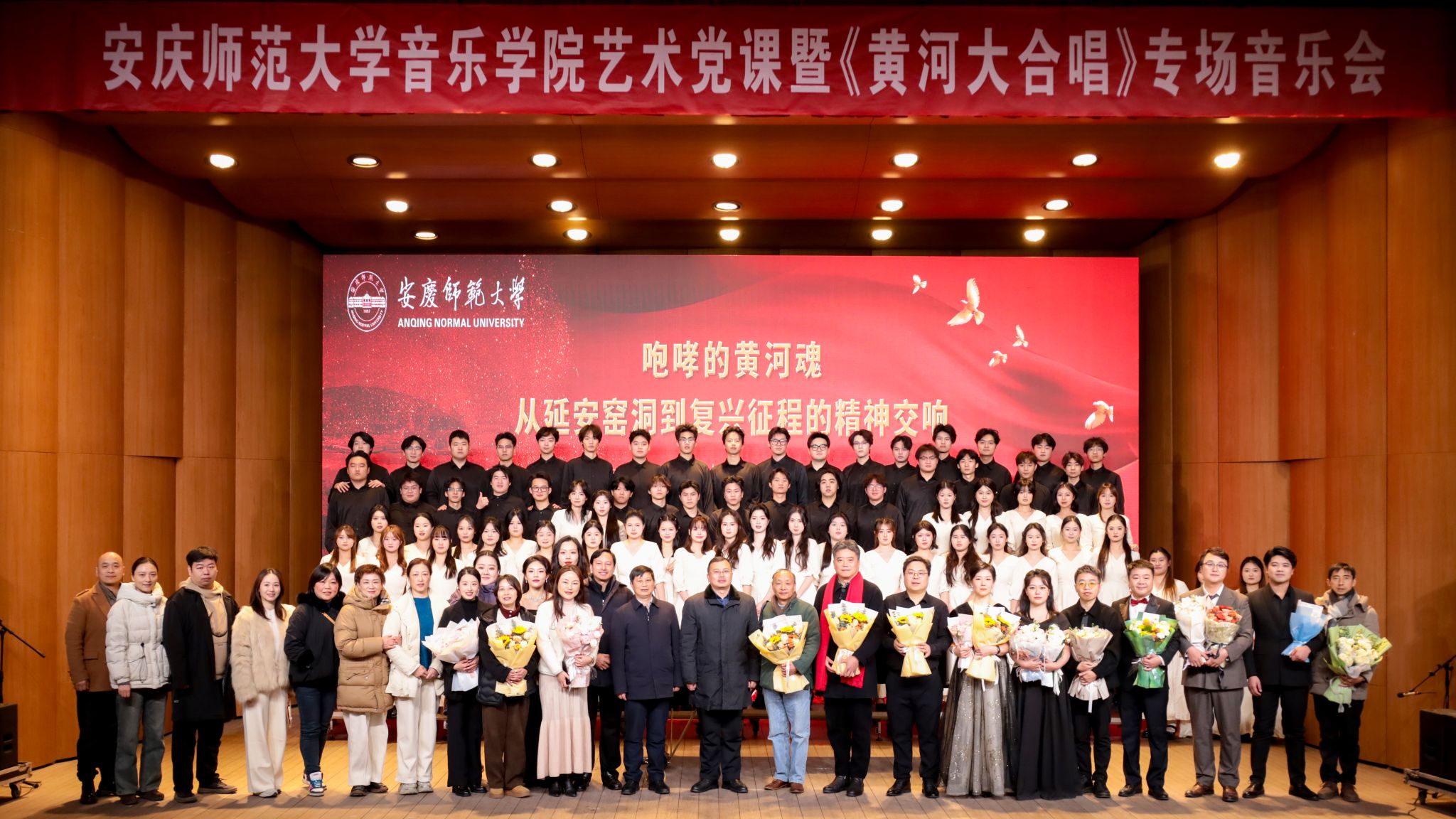 12月26日,音乐厅内气氛庄严热烈,一场以“唱响黄河魂,奋进新征程”为主题的学院艺术周专场演出在此举行。校党委常委、组织部常务副部长计裕人、院党委书记张铭等嘉宾以及全院师生齐聚一堂,共同观摩。此次活动是学院首次完整演绎《黄河大合唱》八个乐章,并创新性地以一堂生动的“艺术党课”形式,融红色经典于艺术实践,用歌声传承精神,以旋律激荡人心。