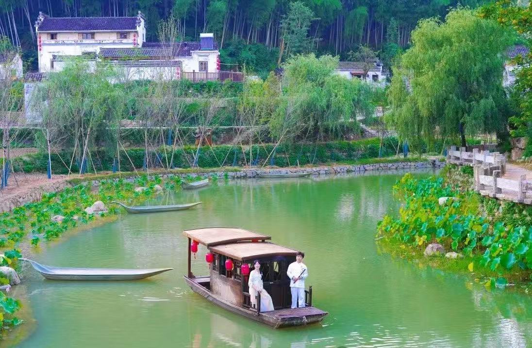 一艘乌篷船顺着潺潺流水慢行,表演者轻按竹笛,温婉歌声与笛声交织成网,水车旁青石板上,身着水袖长裙的女子正舒展腰肢,踮脚、旋身、甩袖间尽显古典舞柔美灵动,表演者的动作与岸边的粉墙黛瓦形成一幅未被过度修饰的水墨画,引得游客驻足。“这种将艺术与地域文化融合的表演形式,让我感觉特别有意义,有时看到游客专注的欣赏表演,我明白自己不仅在表演,更是在传播文化。”王梦强说。