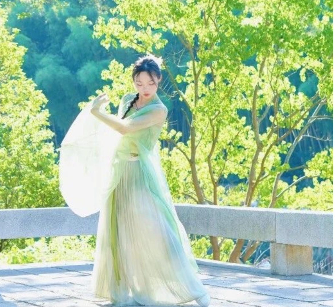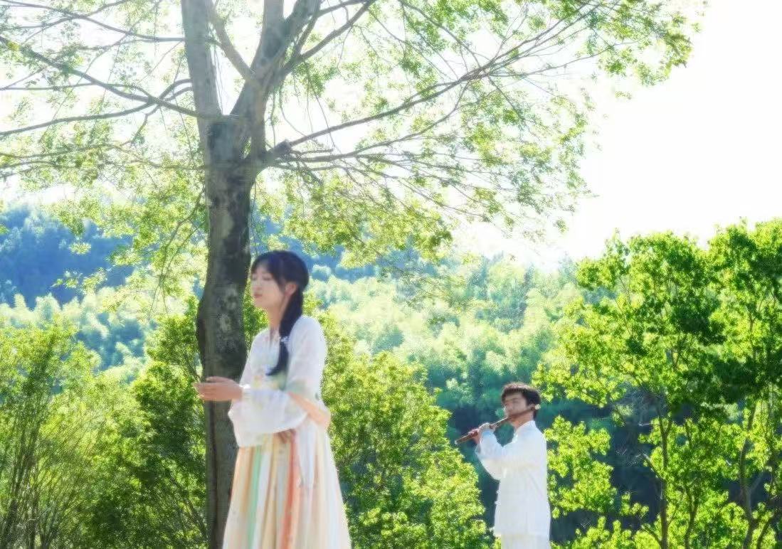 毕业生音乐学专业2021(3)班的郑玉婷身着一身青色舞服,在水车旁舞动着衣袖、以腰为轴、双手在身体两侧侧弧画圆,两脚跟并拢脚尖向外。“大灵山旅游度假区拥有深厚的历史文化底蕴,我们后期也想通过精心编排的音乐和舞蹈,将景区背后的历史典故、民俗风情等文化元素生动地展现出来,带动游客对当地传统文化产生兴趣和认识。”她分享,为了促进节目编排,我们会私下查阅了解当地的民俗资料,还向景区的老员工请教。
